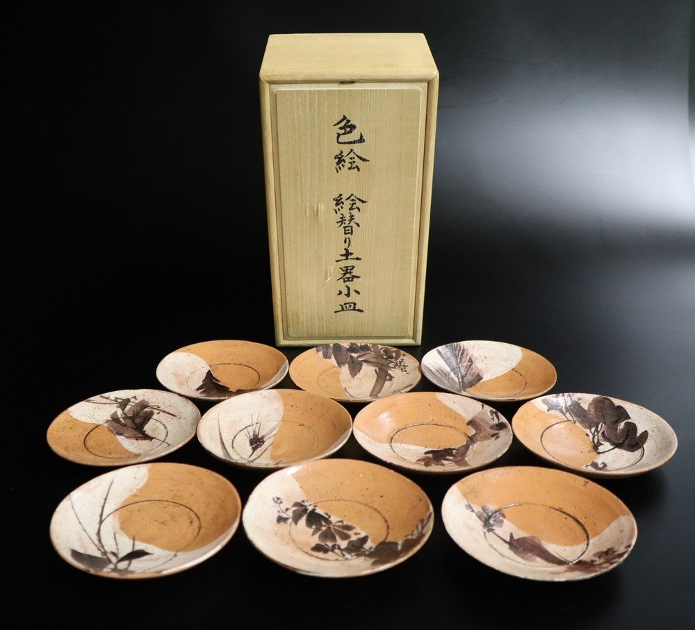 - 【江】尾形乾山作 色絵 絵替り土器小皿 銘々皿 10客 直径11.2㎝ 在銘 木箱 古美術品(懐石料理道具旧家蔵出)XZ116 OTgjfi LTLBplas