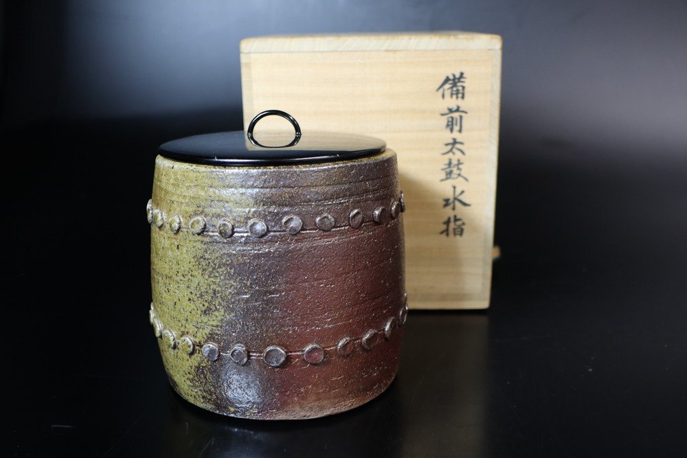 - 【江】備前焼 太鼓形水指 直径約13㎝×高さ13.5㎝ 今日主 書付箱 古美術品(茶道具茶器水器)X1919 CTDBkkio