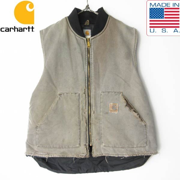 > 2000年製 USA製 carhartt カーハート ダック ベスト XL程度 腰ゴム ダメージ フェードカラー 00s アメリカ製 ビンテージ D152-05-0006ZVW