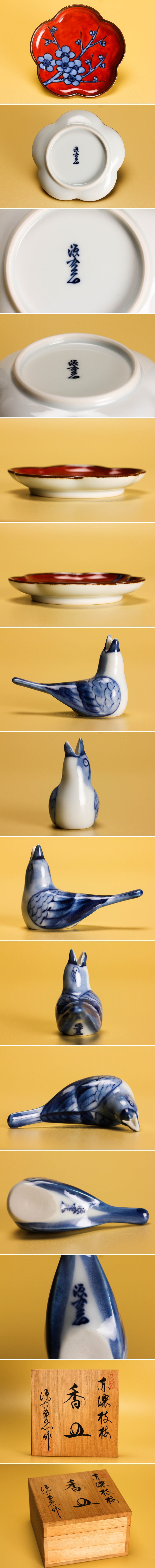 - 館林源右衛門 赤濃枝梅香皿 鳥形香立 共箱 本物保証