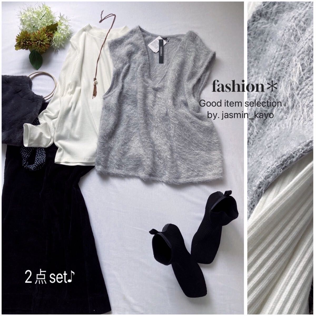 - ◆新品LL~3L/L◆2点set*ローゲージシャギーニットベスト×ハイネックリブtops*軽く綺麗なシャギー感*ライトグレー×オフホワイト