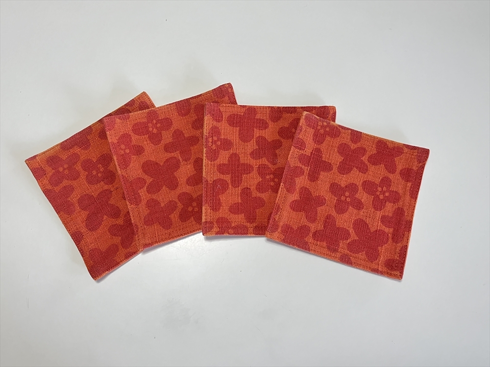 - 花とら●リサイクル小物 麻 コースター 4枚まとめて 未使用品 美品 橙 花 幡 251013