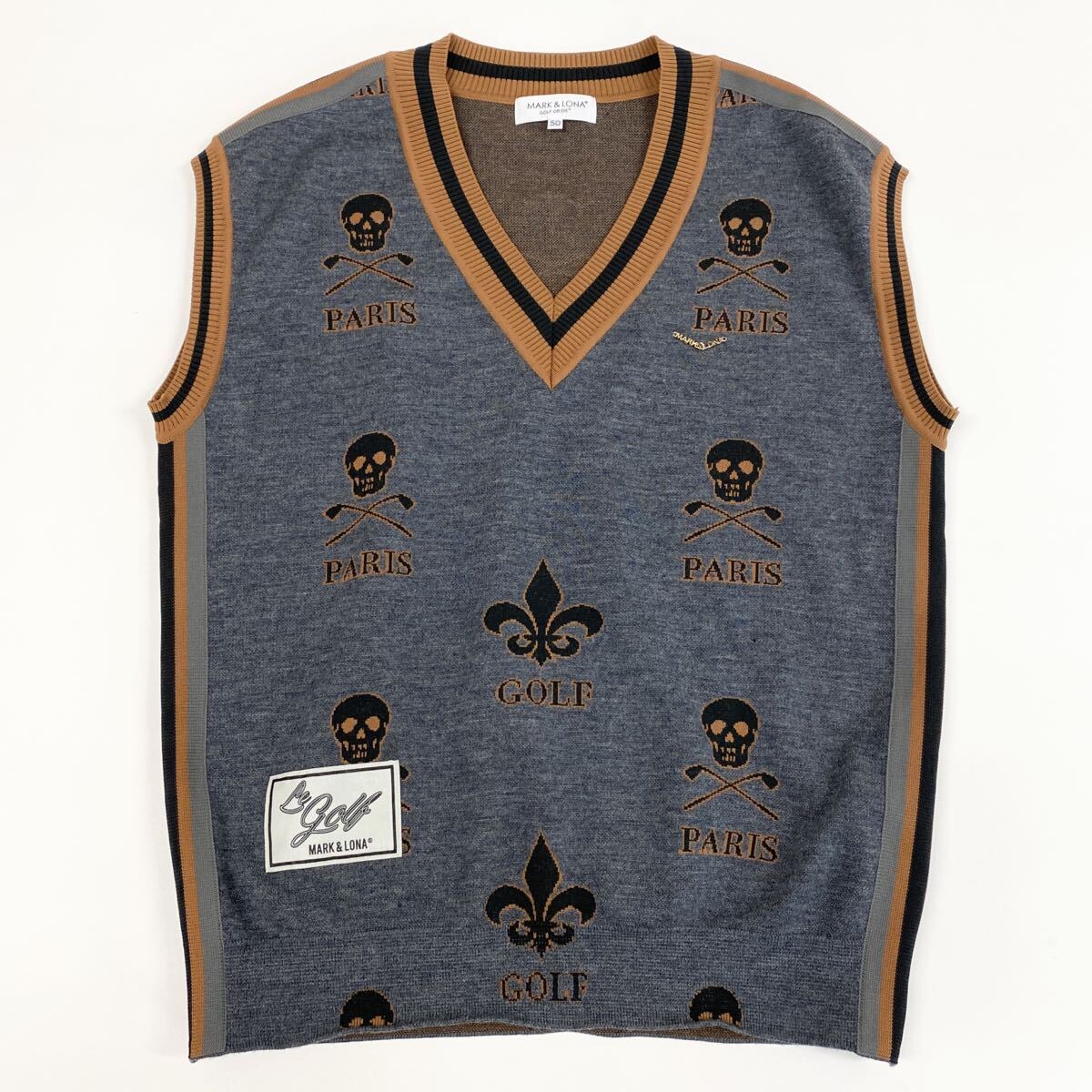 - oj29 MARK&LONA マークアンドロナ ゴルフウェア ニットセーター Vネック ニットベスト ガイコツマーク 総柄 メンズ 紳士服 50 L相当