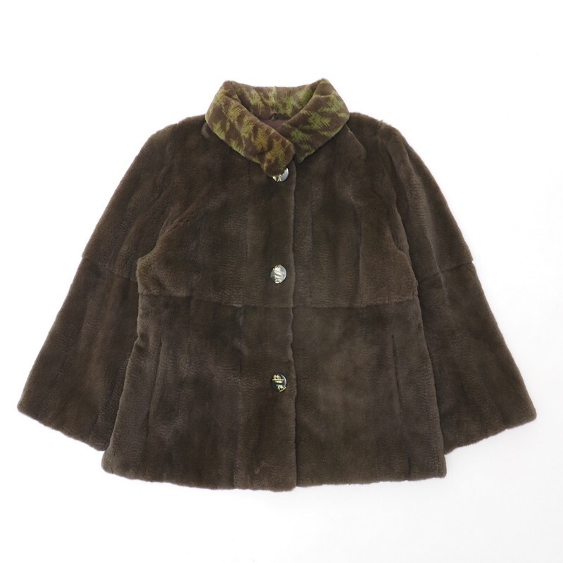 > MI2174★ジョセフィーヌ リアルシェアードファー 襟:総柄 装飾釦 ショート丈コート ファージャケット カーキブラウン レディース サイズ9