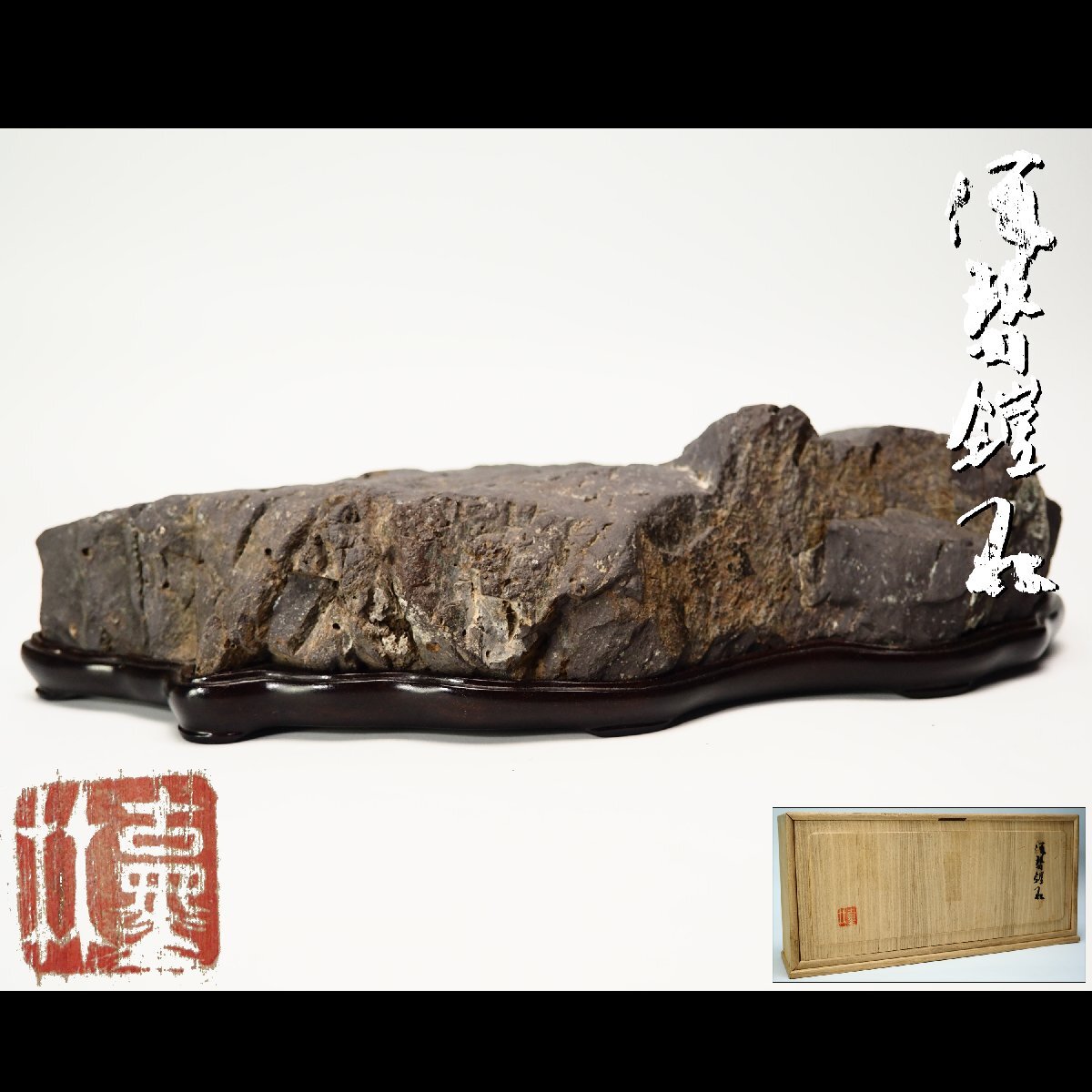 > 【治】自然石天然石 伊勢鎧石 盆石置物☆箱付 唐木台座付 台込 幅27cm (検索:水石 奇石 盆景 盆石 盆栽 岩石 石 飾石 観賞石) RJ1818