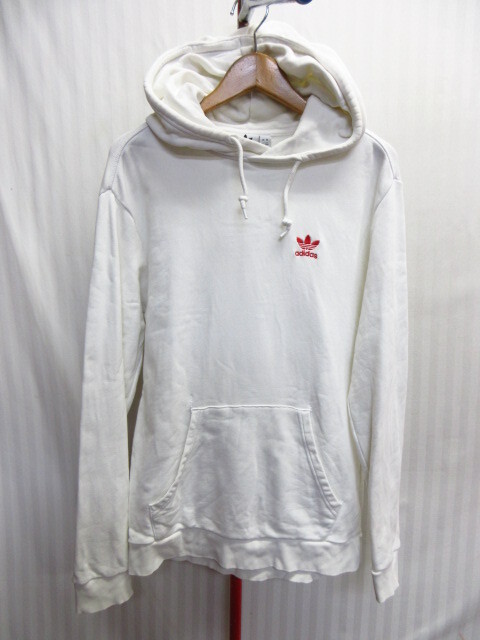 > アディダス トレフォイル刺繍パーカー メンズL 白 三つ葉ロゴ スウェットパーカー フーディー フード付きジャージトップ トレーナー10231