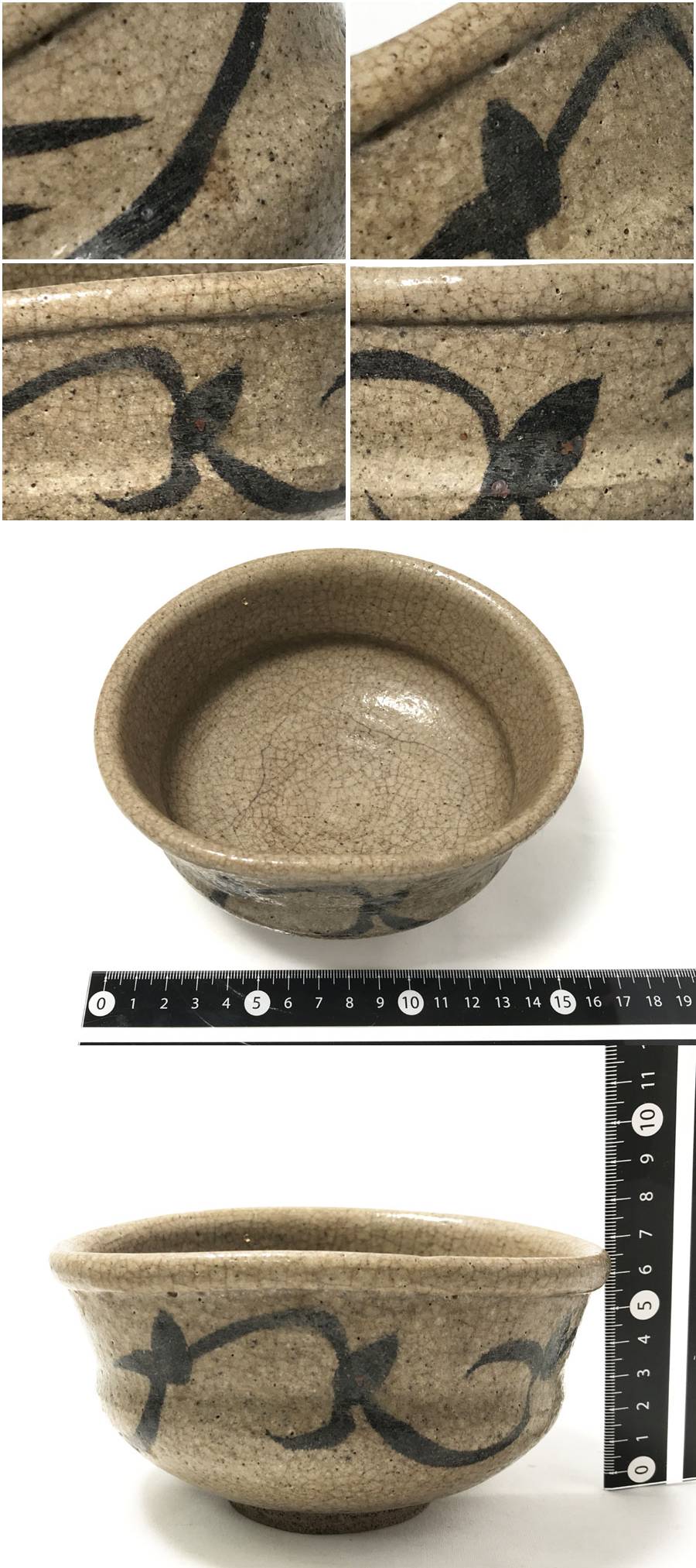 - ◆未使用! 唐津焼 絵唐津茶碗 唐草木葉絵 茶器 抹茶椀 貫入 茶道具 口径最大約14.8cm 高さ約7.3cm