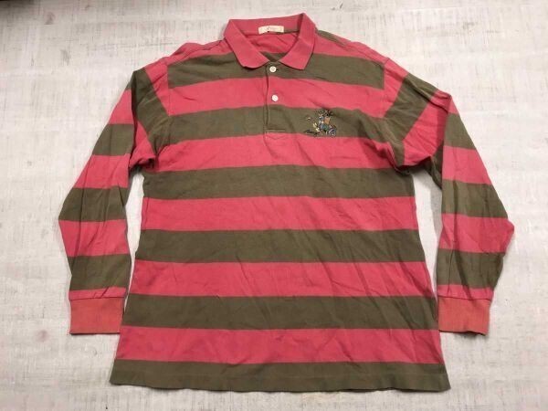 - Axy アクシー ゴルフ GOLF キャラクター 刺繍 OLD オールド レトロ ユーズド 90s 古着 ボーダー 鹿の子 長袖ポロシャツ メンズ LL ピンク