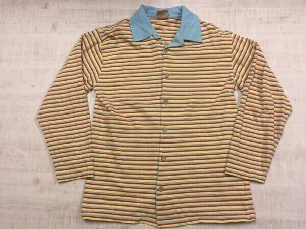 > PLEVO プレボ サーフ アメカジ レトロ オールド 古着 ストリート ウッドボタン マルチボーダー長袖シャツ メンズ L 黄色