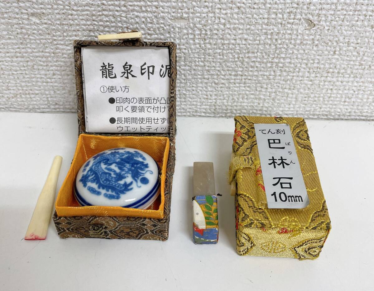- 【 てん刻 巴林石 印材・ 龍泉印泥(朱肉)2点セット】乾隆年製/ぱりん材 10mm/朱肉/A710-201