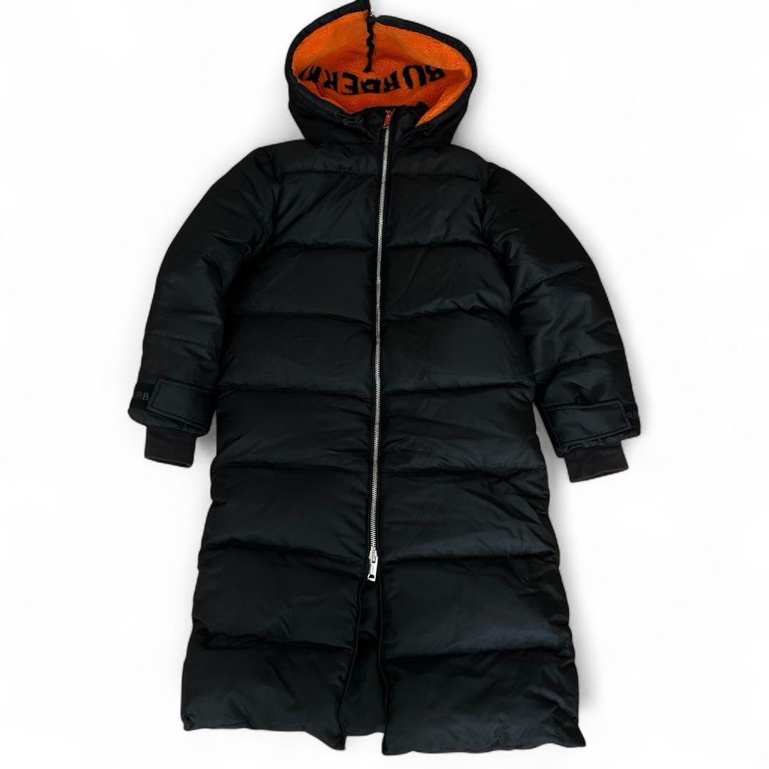 > 美品 バーバリー BURBERRY 現行品 ロングダウンコート ロゴ柄 フードボア ジップアップ ブラック グースダウン 黒色