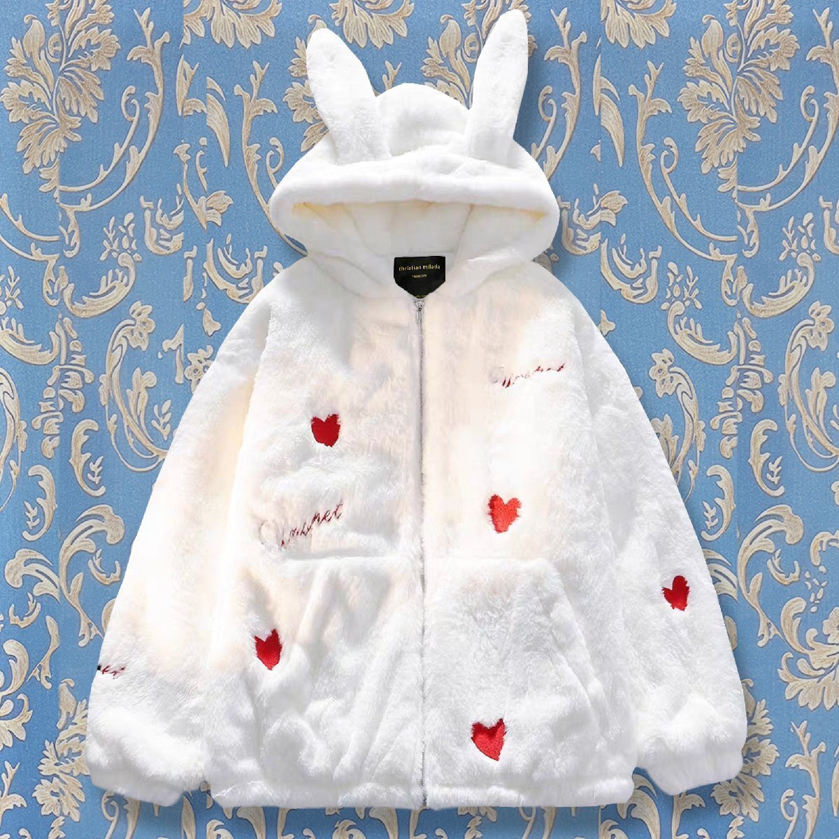 - 定価8万★christian milada・ミラノ発・ファーコート★高級ミンク混 ふわふわ 保温 ソフト フード付き ウサギ耳 刺繍 可愛い レディース XL