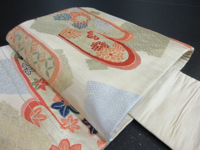 - 1円 中古 名古屋帯 正絹 和装 和服 ヱ霞 地紙 割付文様 草花 花柄 六通柄 九寸帯 長さ336cm【夢職】★