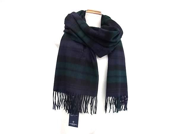> 1円 ■新品同様■ Johnstons of Elgin ジョンストンズ オブ エルガン カシミヤ100% フリンジ マフラー ネイビー系×グリーン系 FN4855
