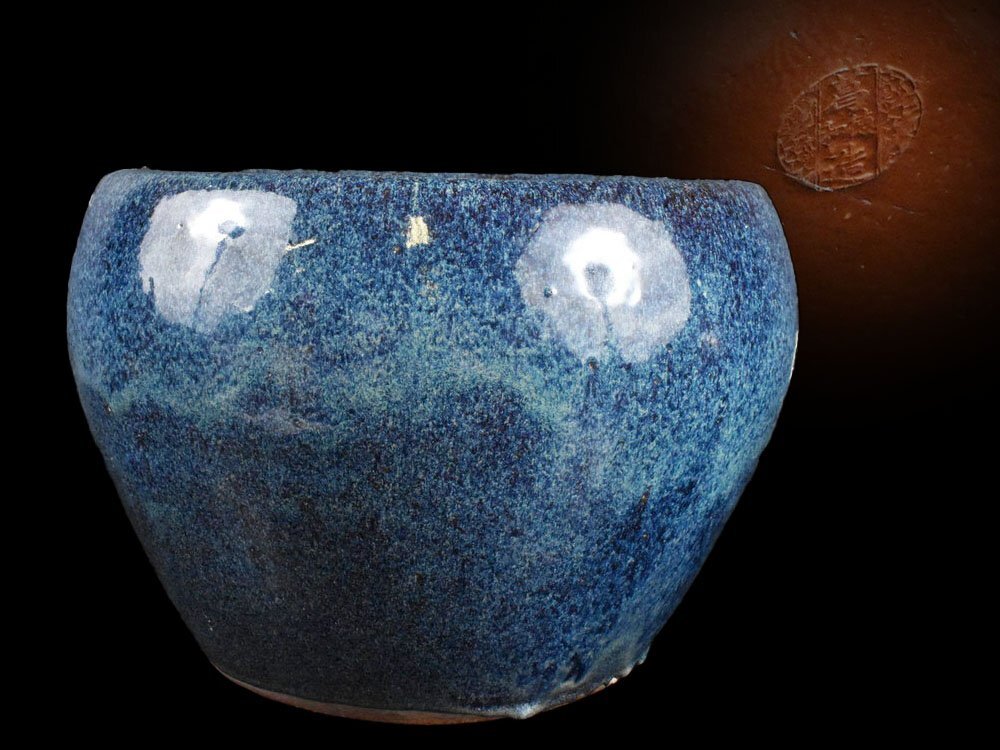 > 【雲】中国美術 中國 葛徳和造 底款 海鼠釉 特大 火鉢 瓶掛 高さ26.5cm (煎茶道具 古玩 唐物 時代物)J1966 OTghju