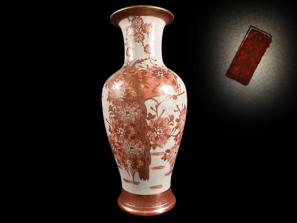 - 【雲】某有名資産家買取品 薩摩焼 赤絵金彩孔雀牡丹細密絵付大花瓶 飾壷 高さ64.5cm 丸十字家紋 古美術品(旧家蔵出)DJ630 OTDgunht