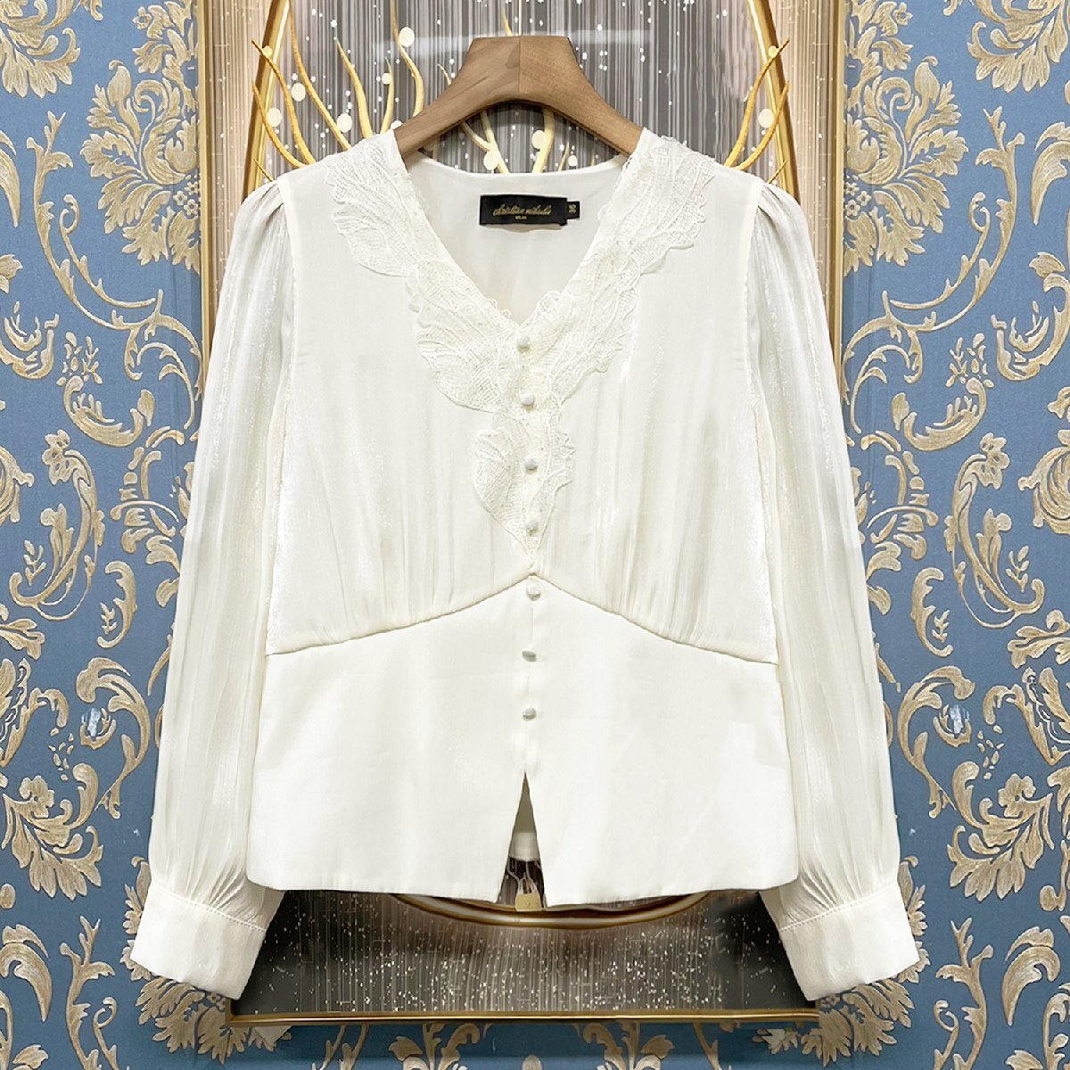 > 定価4万★christian milada・ミラノ発・ブラウス★上品 シルク混 光沢 薄手 滑らか 長袖 レース エレガント 着痩せ デート OL S/34サイズ