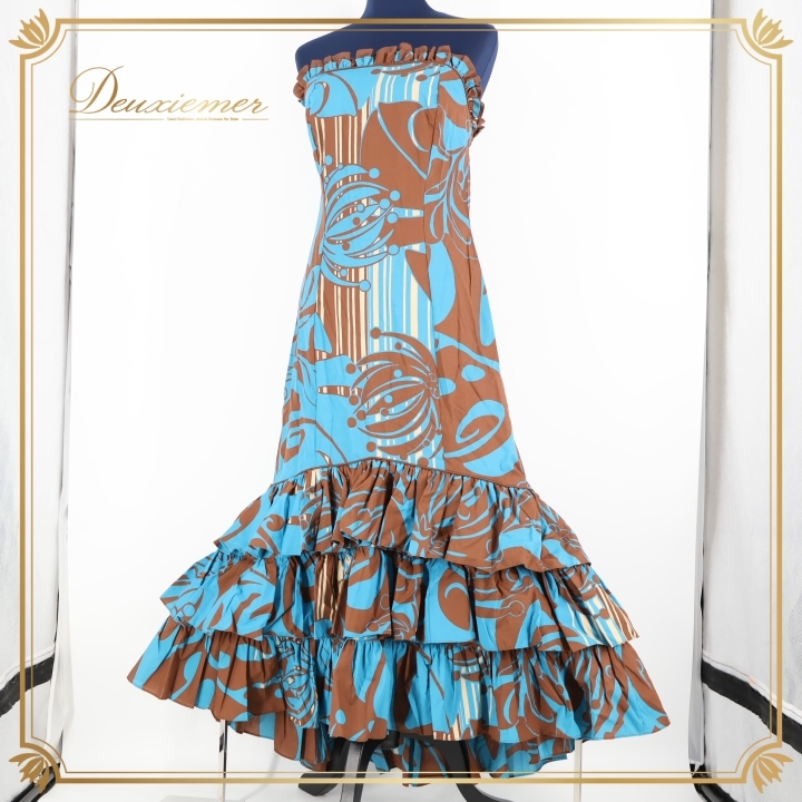 > フラダンス 衣装 ワンピース ドレス ブラウン系 MAPUANA フラ ダンス フリル 茶 ターコイズブルー系 レフア柄 花柄 ハワイアン ブルー系