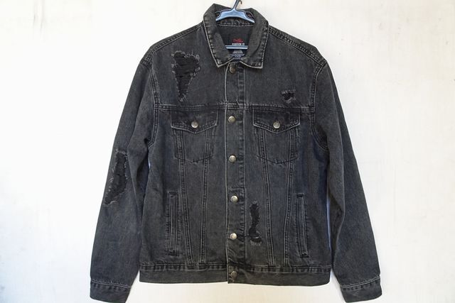 > FOREVER21 MEN/Artist Edition/ジージャン/デニムジャケット/アルフォンス・ミュシャ/やぶれダメージ/黒/ブラック/USサイズXS(10/31R7)