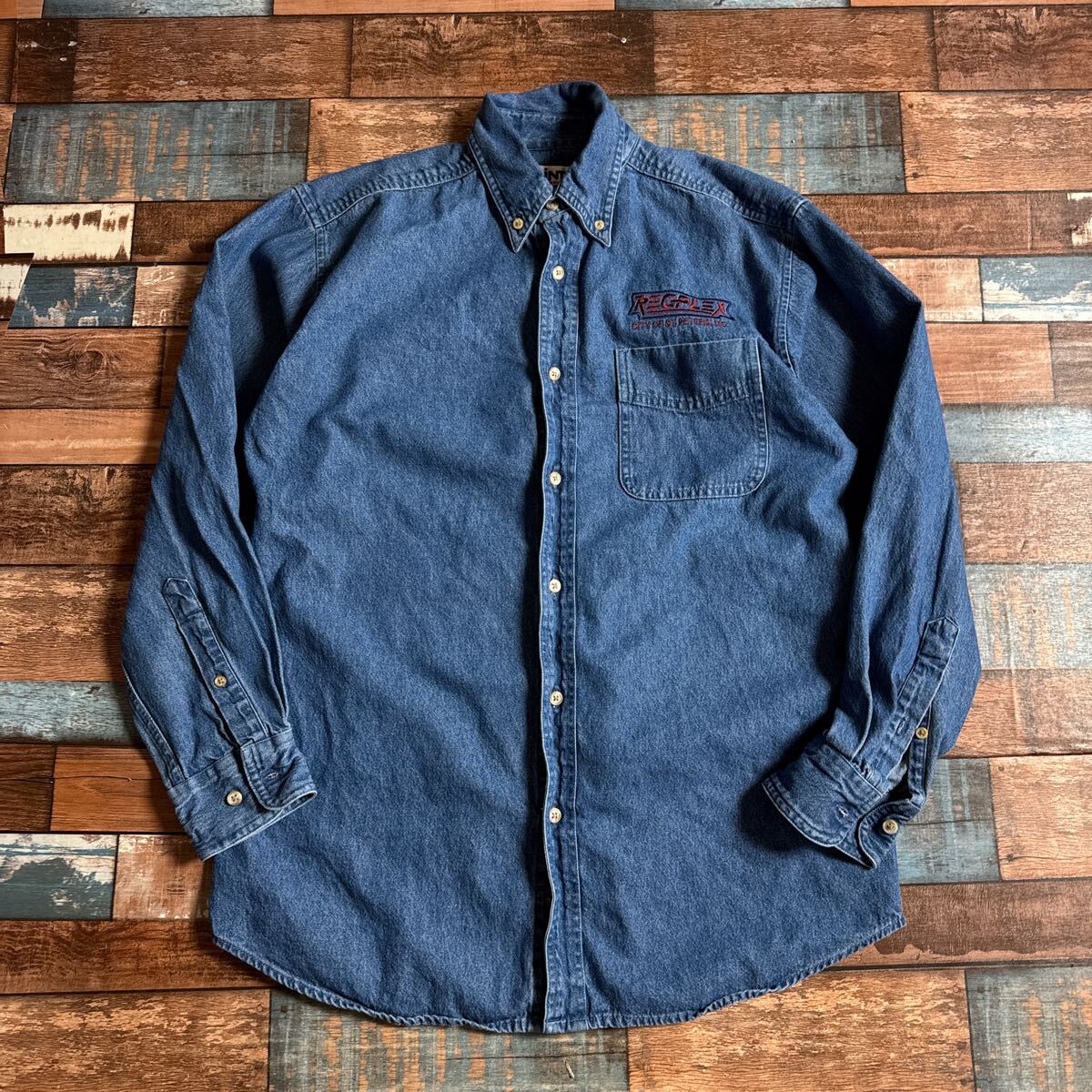 - CINTAS デニムシャツ REGFLEX刺繍ロゴ ワークシャツ 長袖 M相当 ブルーデニム アメリカ古着