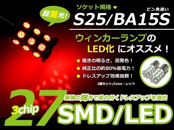> 超パワー LED バルブ S25 段違い 180度 並行ピン SMD 27連 レッド/赤 W球 2個sEt ダブル球 W球 ウインカー球 ブレーキ球 バックランプ