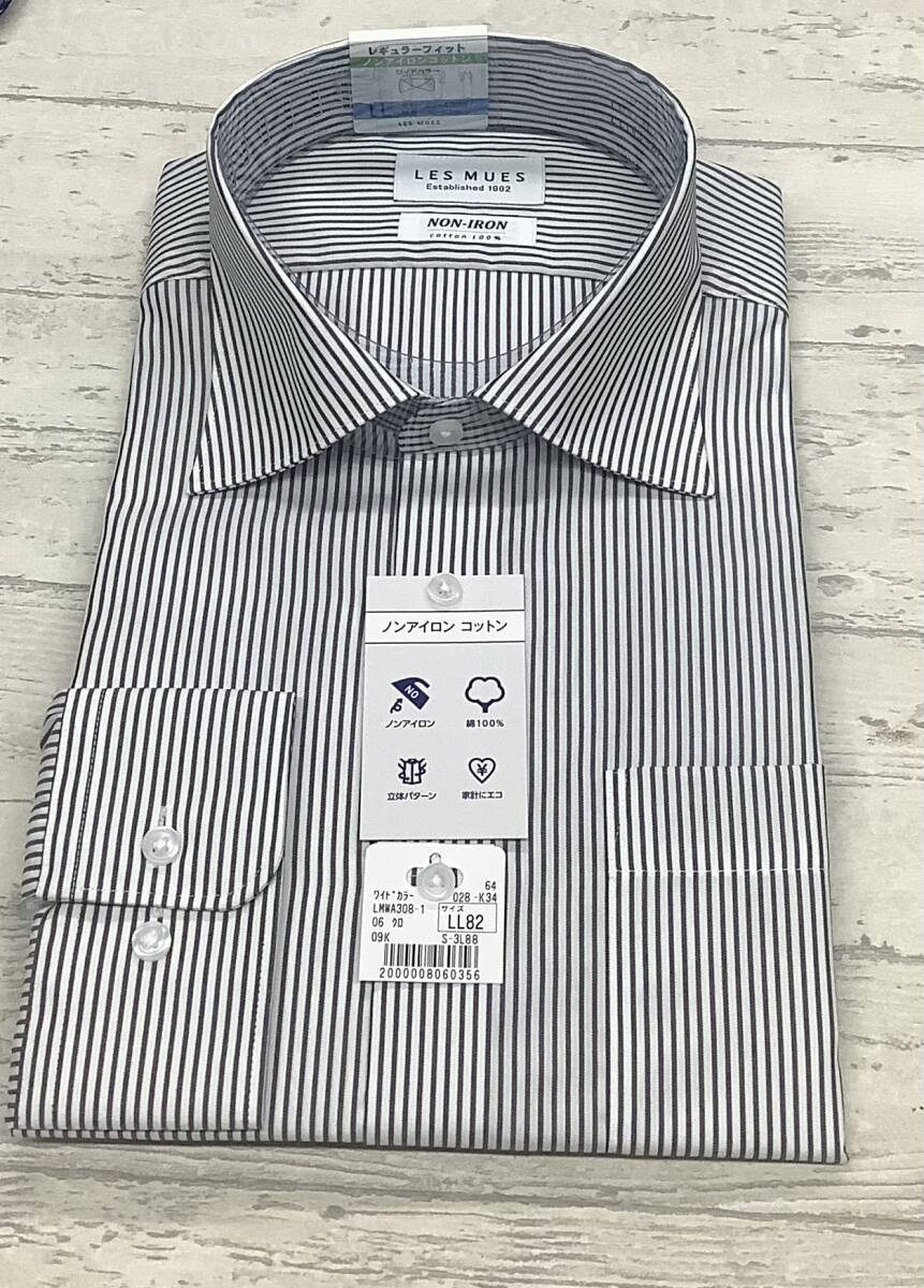 > ★43-82★LLサイズ 定価4,990円の品★綿100% ワイドカラー★ノンアイロンコットン 白ベース黒ライン ストライプ柄