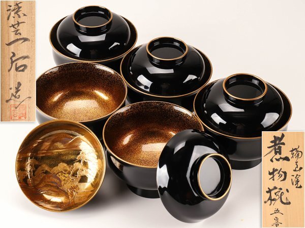 【流】能登輪島塗 一后造 最高級蒔絵椀五客 共箱 LC427