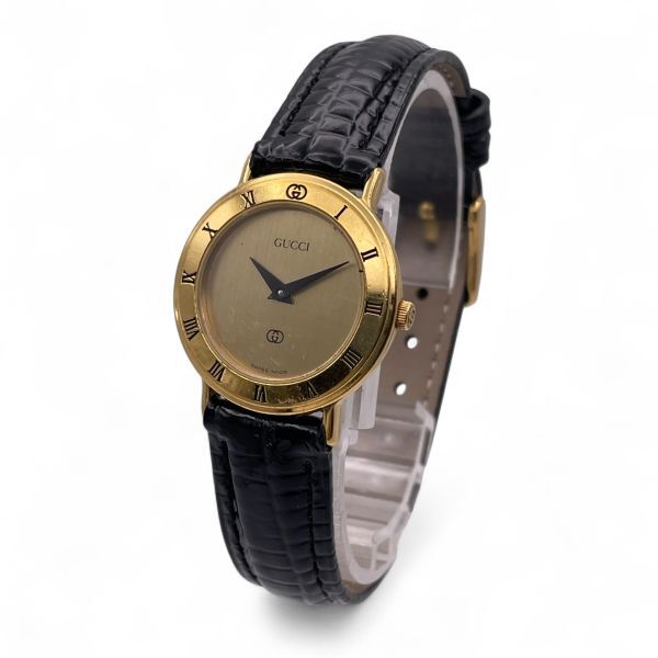 - 1円 美品 ■ 稼働 GUCCI グッチ 3000L レディース 金文字盤 2針 ローマンベゼル アナログ レザー ベルト N5117-61-54