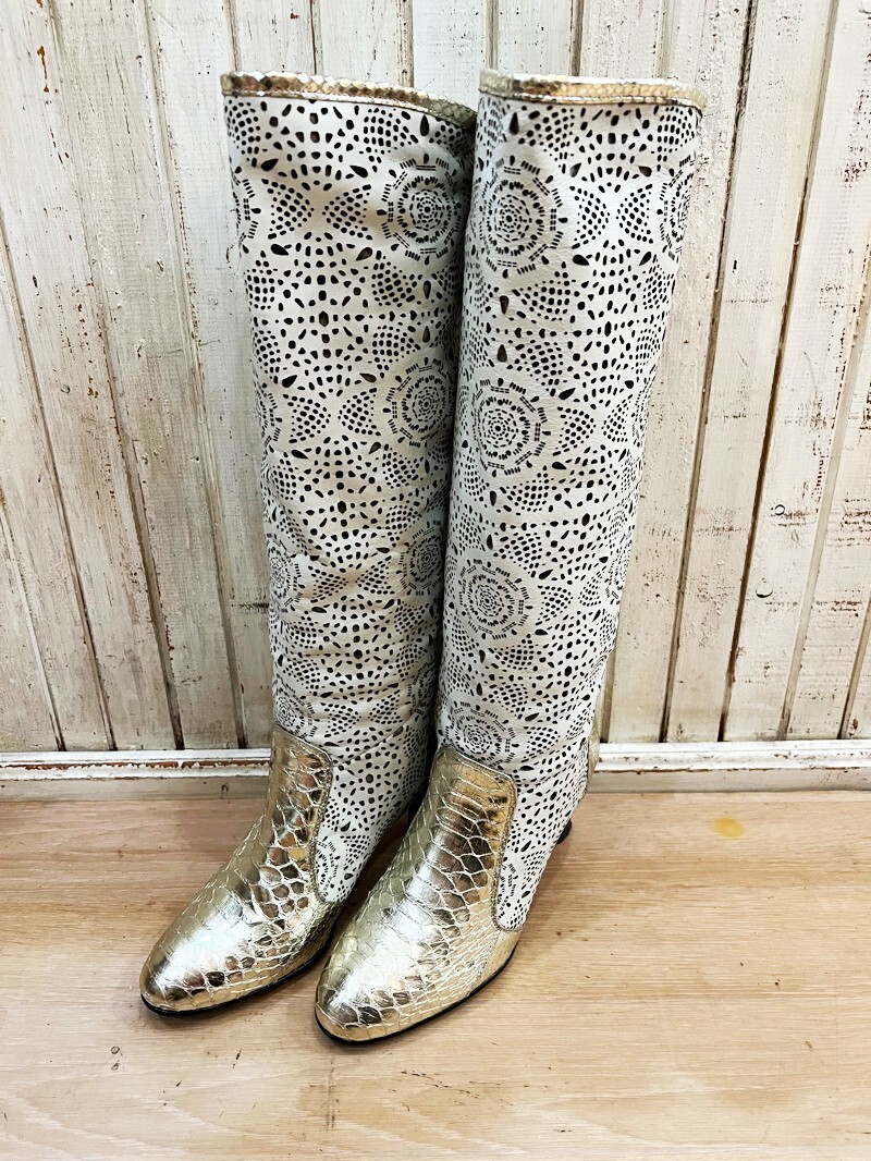> 2090★SHOE GALLERY OTA/シューギャラリーオオタ パンチングレースデザインクロコ調ロングブーツ ゴールド系 レディース ブーツ 22cm ★
