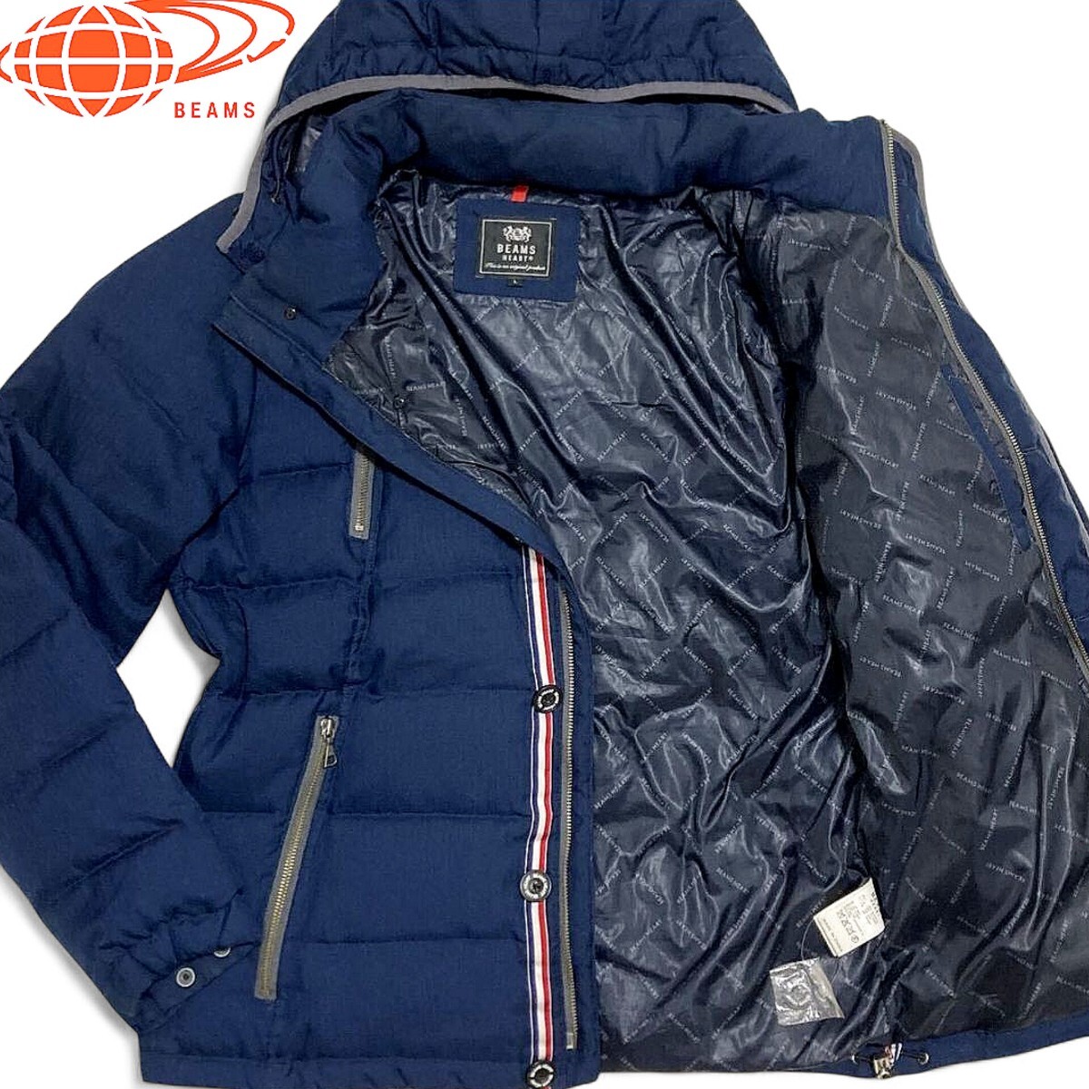 - 未使用級●L ビームスハート メンズ 肉厚ダウンジャケット トリコロール 2way フード着脱 近年モデル BEAMS HEART パイピング ネイビー 紺