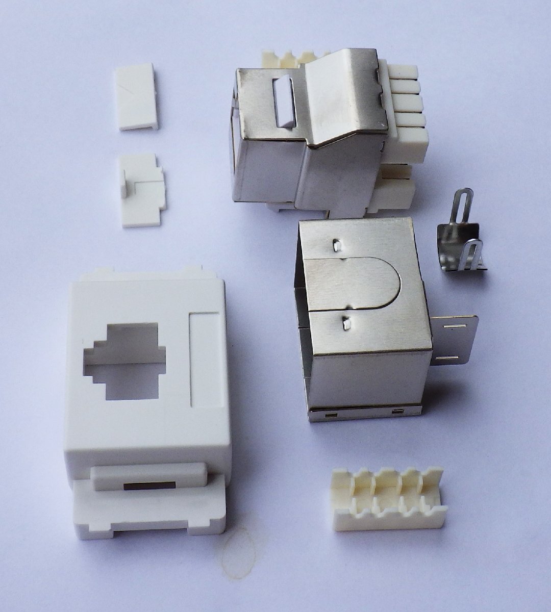 - Cat.6A 180度 FTP埋込メタルシールド モジュラー ジャック、IDC: クローネ、キャップ付き3方向ケーブル出し