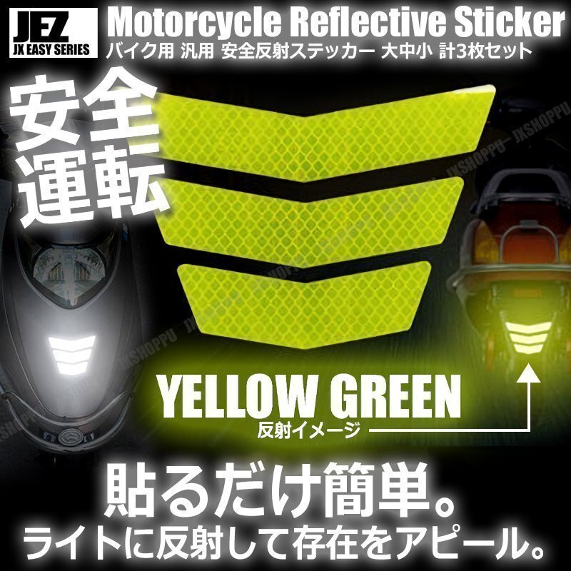 > 送料0円 バイク用 反射ステッカー [黄緑] 大中小 各1枚 計3枚セット 安全 ツーリング 反射板 リフレクター シール 夜間 目立つ 後部