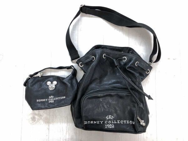 > THE DISNEY STORE ディズニー ストア ミッキーマウス型金具 フェイクレザー 巾着 ドロー ショルダーバッグ ポーチ 2点セット レディース 黒
