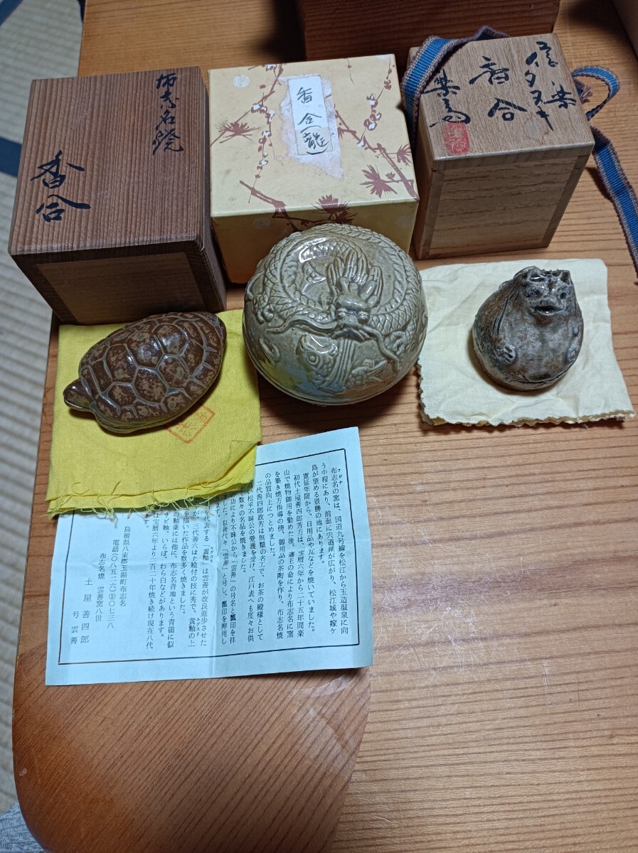 - お茶道具 香合 1)布志名焼 雲善造 亀型 2)信楽焼 高橋 楽斎造 たぬき型 3)青磁 陽刻 龍型 3点