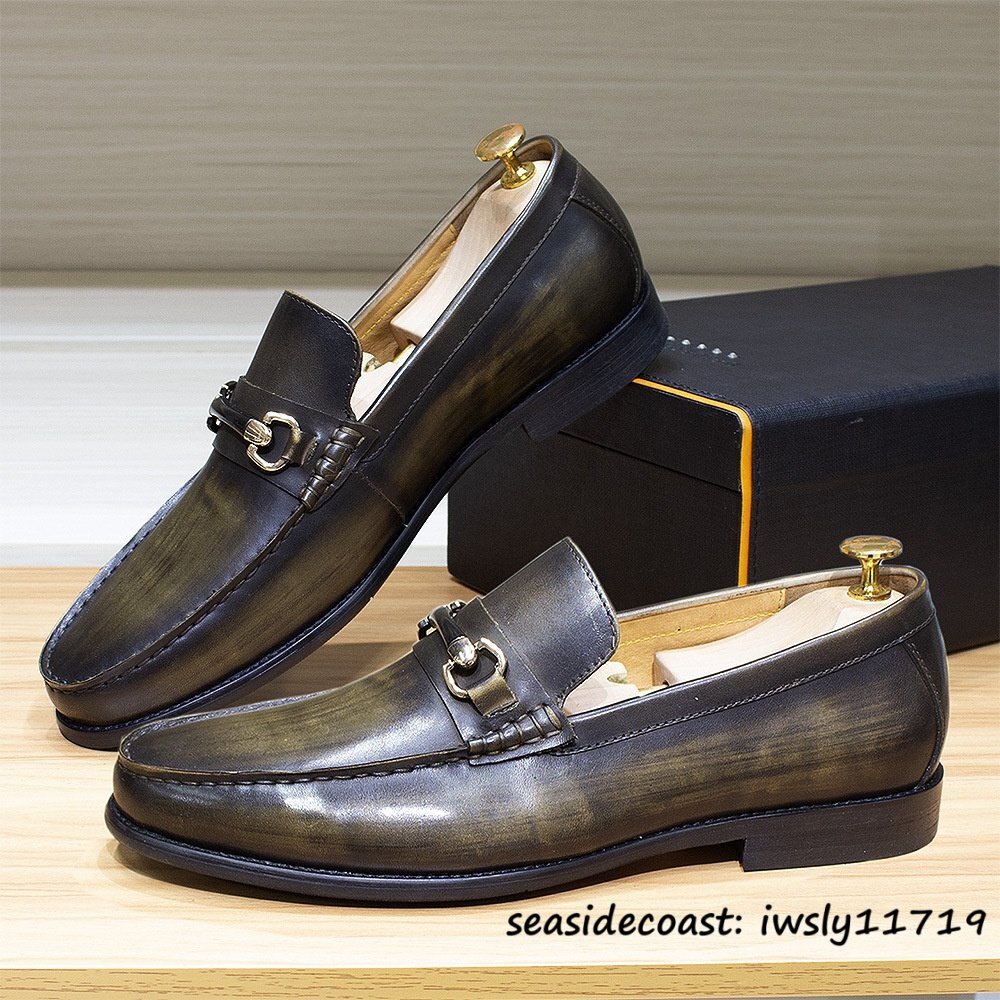 - 最高級★定価9万 本革 レザーシューズ 新品 ビジネスシューズ メンズ 職人手塗仕上げ 超希少 ローファー 紳士靴 牛革 革靴 オリーブ 28.0cm