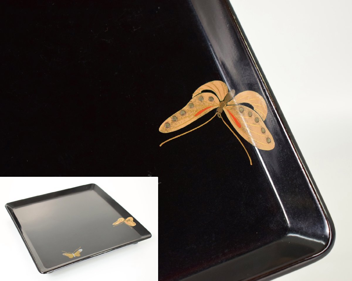X935 【泉美】漆芸 漆器 蝶蒔絵 脚付四方盆 菓子盆 菓子器