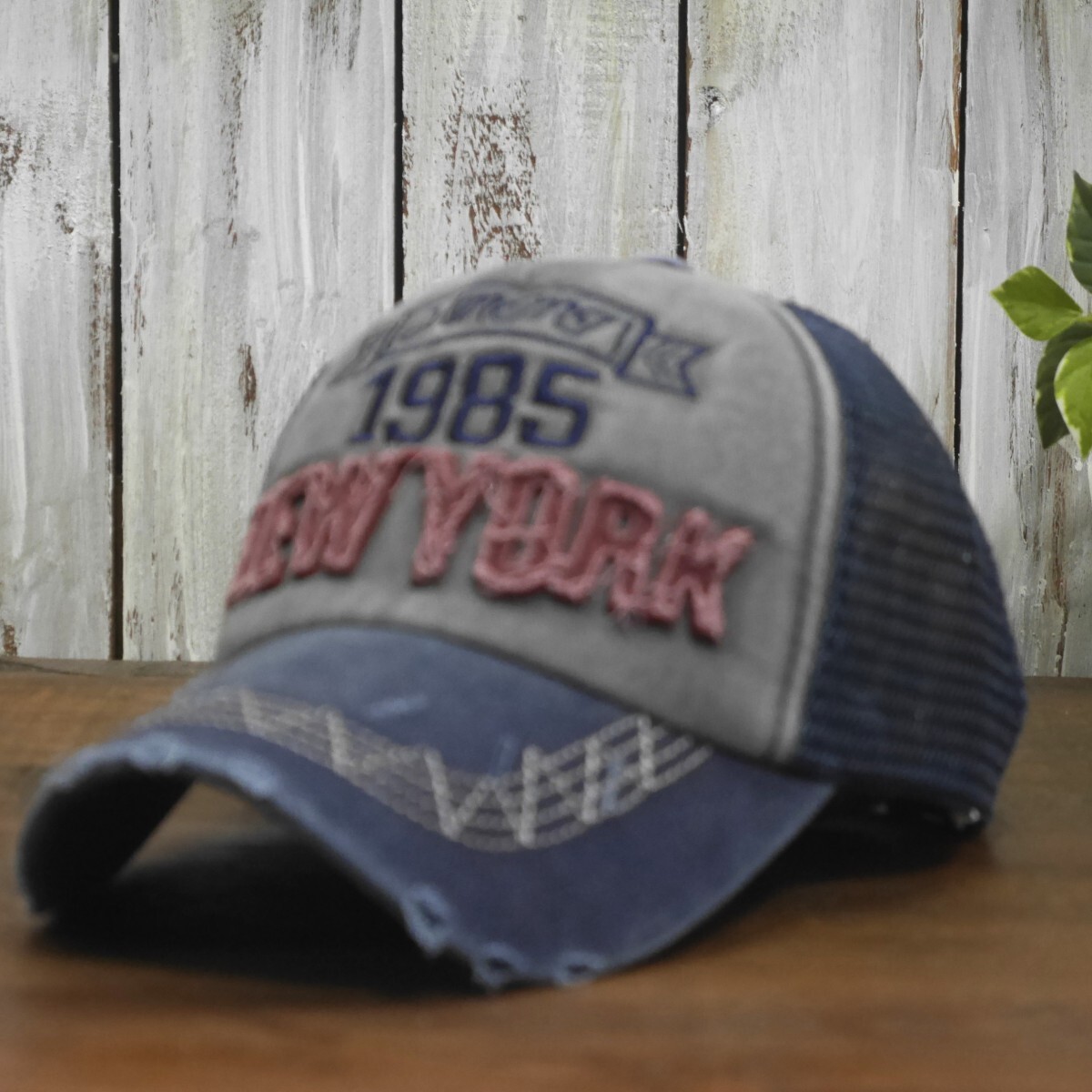 - NEW YORK CITY 1985 メッシュキャップ グレー ネイビー ロゴ 色あせ ビンテージ UV対策 サイズ調整可能 送料\450 男女OK