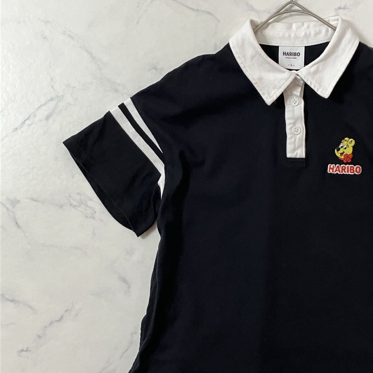 > 美品 GU × HARIBO ジーユー ハリボー ロゴ 刺繍 切替 ラグラン ボタン ポケット 半袖 ポロシャツ ブラック ホワイト S