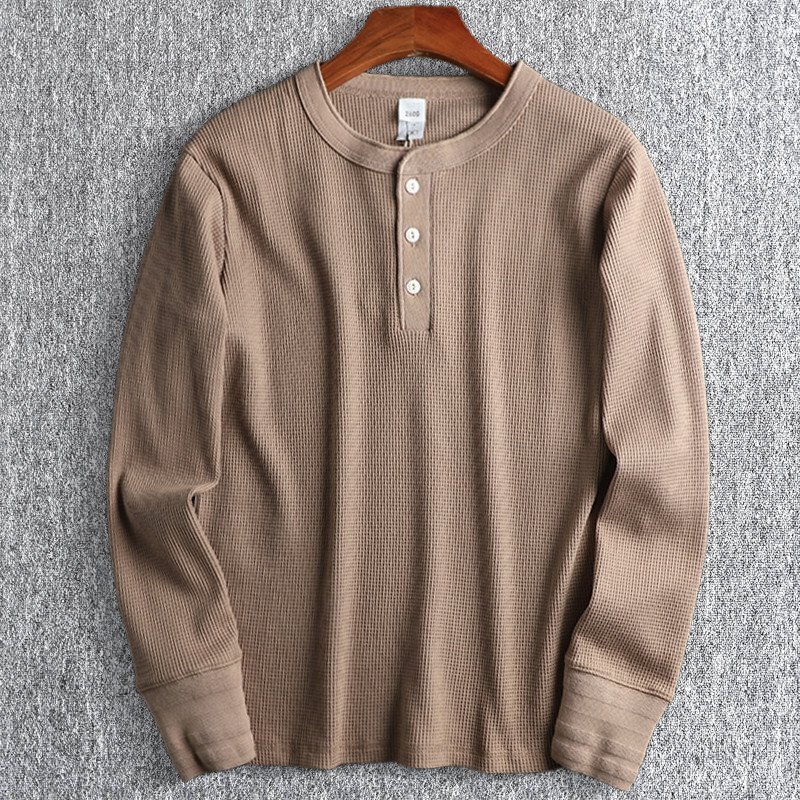 - 新品 欧米 ワッフルカットソー ニット ヘンリーネック 長袖Tシャツ メンズ 薄手 綿混 春秋 快適 カジュアル スポーツ キャラメル T5140-2XL