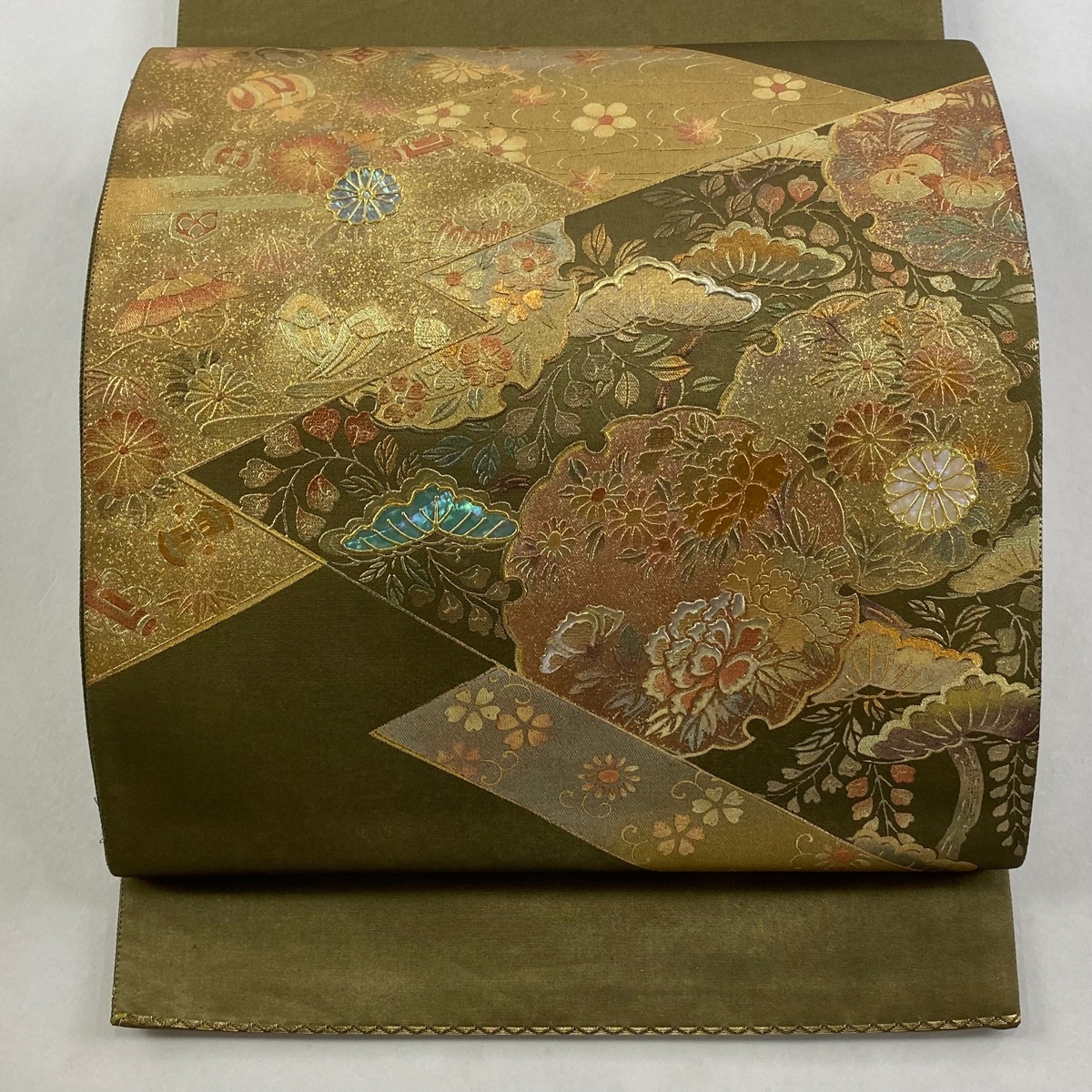 - 【美品】 袋帯 名品 雪輪 松竹梅 螺鈿 金彩 茶緑色 お太鼓柄 正絹 【中古】