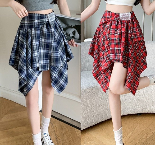 > ミニスカート ショートスカート フレアスカート 裾アシンメトリー チェック柄 シンプル カジュアル XL ブルー