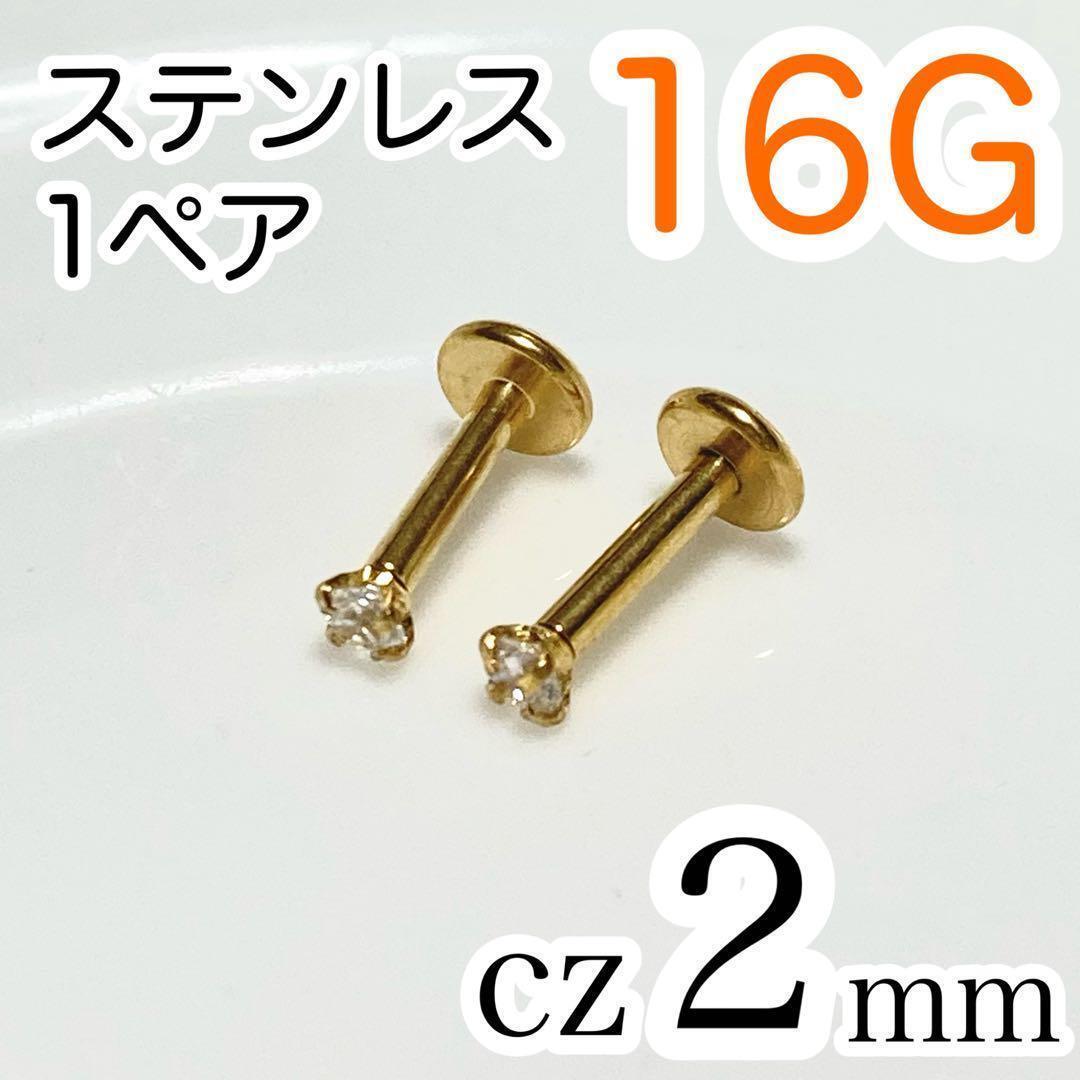 - 【1ペア】16G医療用ステンレスジルコニア2mm ボディピアス ゴールド czラブレット