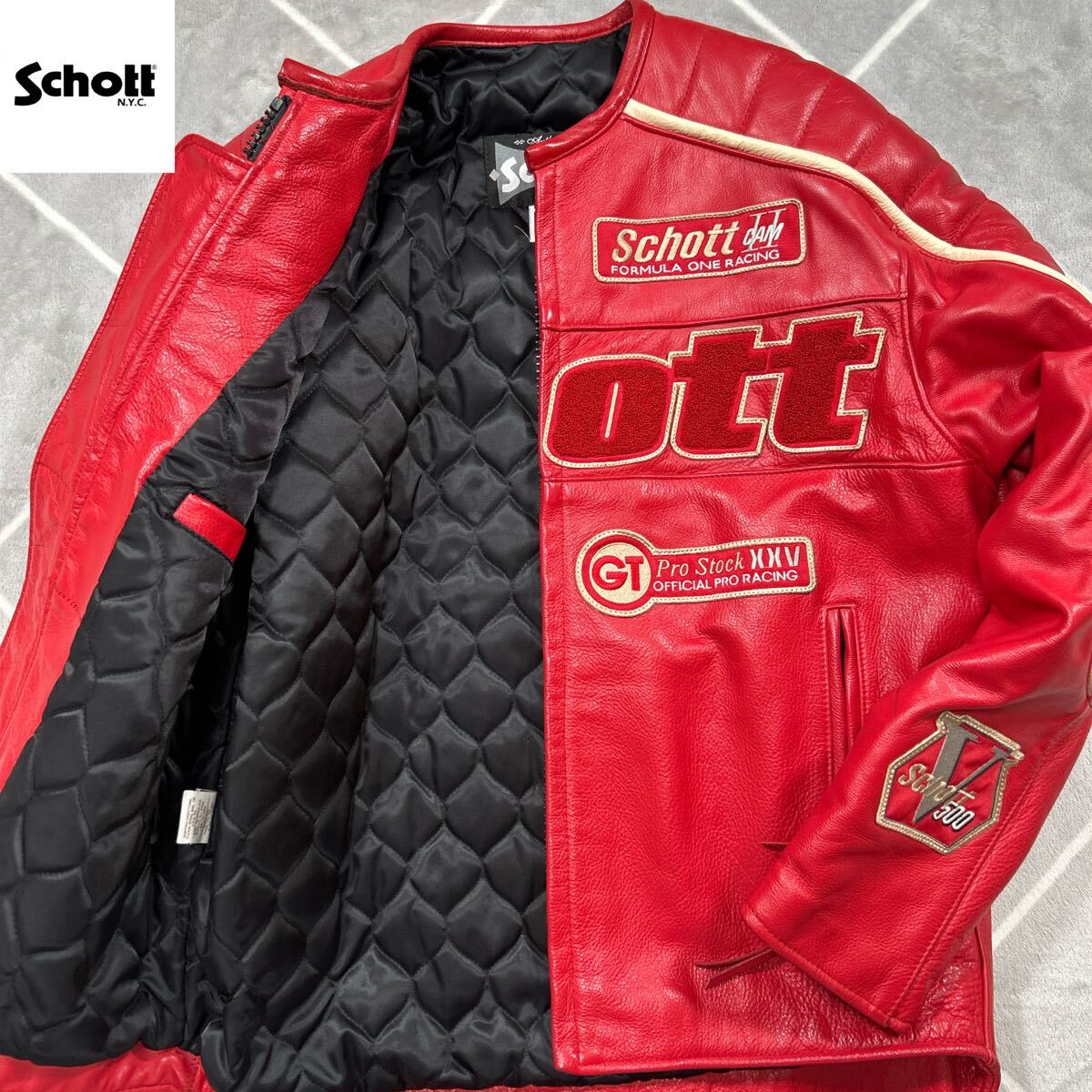 - 【幻の逸材L】USA製 SCHOTT ショット レザー レーシング ジャケット 赤 羊革 ラムレザー【滑らかな手触り】 袖ロゴ 最高傑作【極上の光沢】