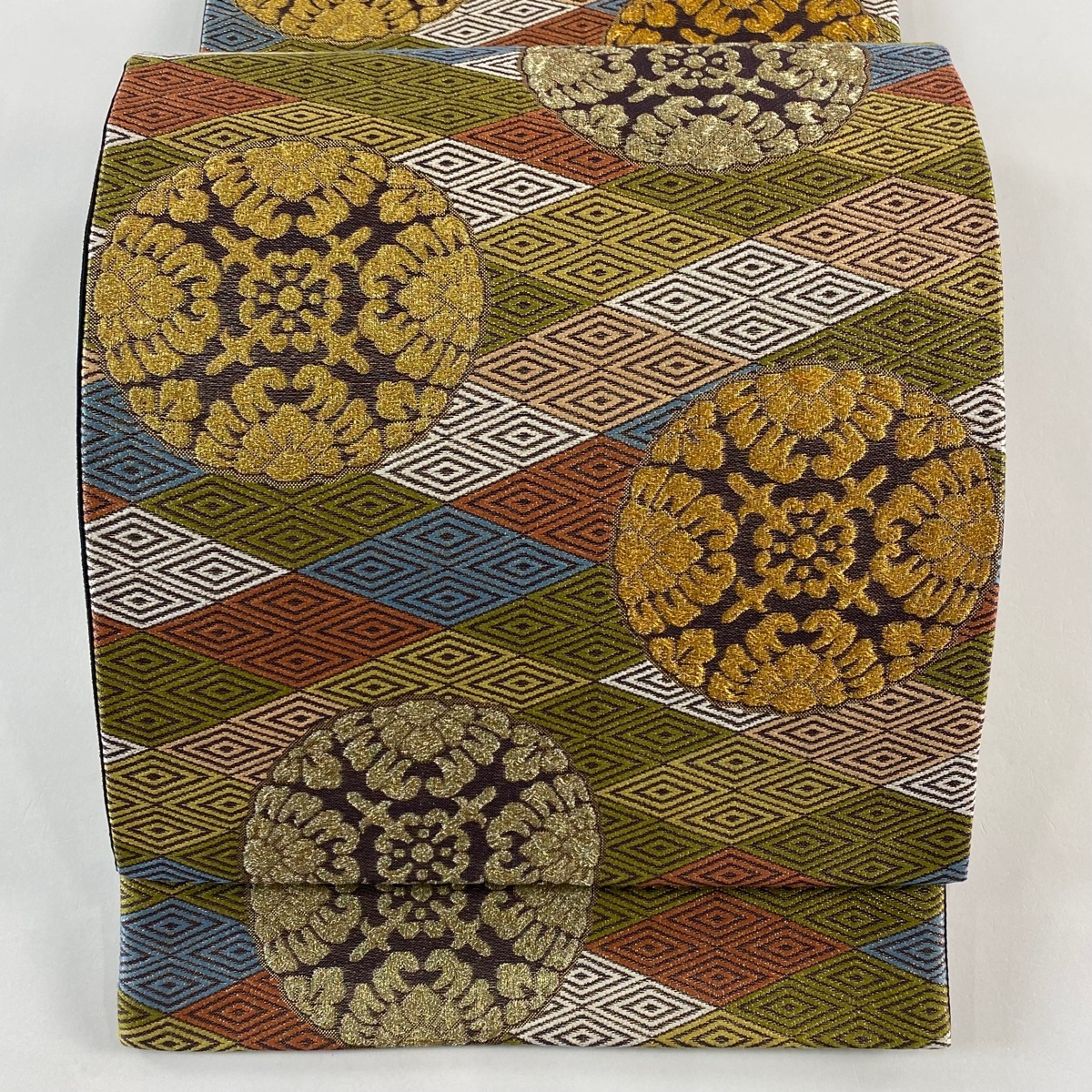 - 【美品】 袋帯 秀品 浮線綾文 入子菱 金糸 茶緑色 六通 正絹 【中古】