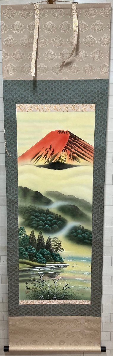 > S245 【模写】掛け軸 1点 赤富士 背景 松風 日本古美術 中国古美術 美術品 骨董 現状品 約185.5×53㎝ 箱付き