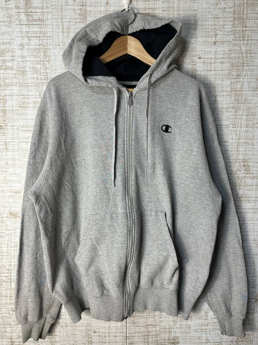- ☆US古着 Champion チャンピオン スウェット フード パーカ ジップアップ ロゴ刺繍 グレー 裏起毛【L】 ◆5366◆