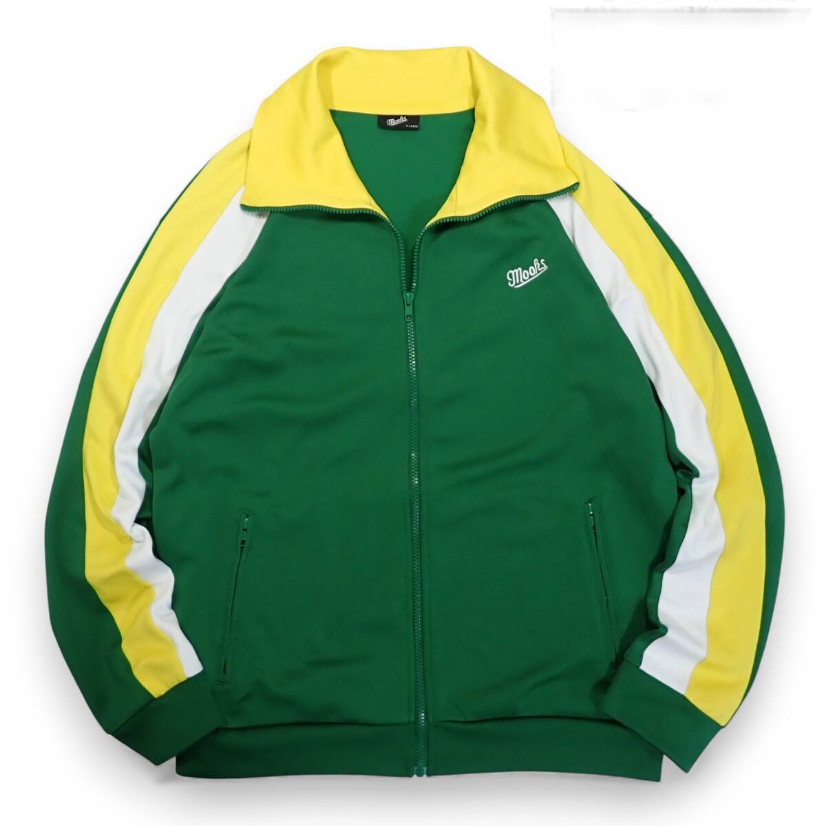 > 美品 mooks トラックジャケット XL●襟高 刺繍 ジャージ グリーン イエロー ホワイトライン 緑 黄 白ムークス●洗濯プレス済●古着7177