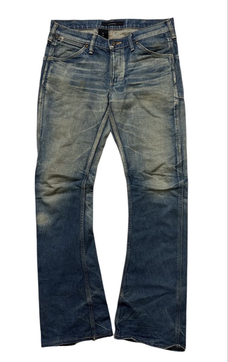 > ▲ AKM エイケイエム × Wrangler ラングラー achromatic ▲ ローライズ ユーズド加工 バナナシルエット ブーツカット デニム M