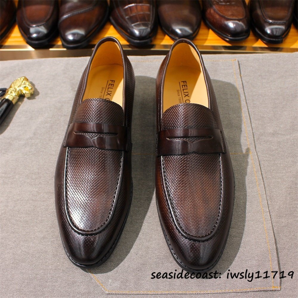 - 最高級■定価10万 ビジネスシューズ メンズ 透かし彫り 本革 レザーシューズ ローファー スリッポン 上質牛革 職人手作り 珈琲色 28.0cm