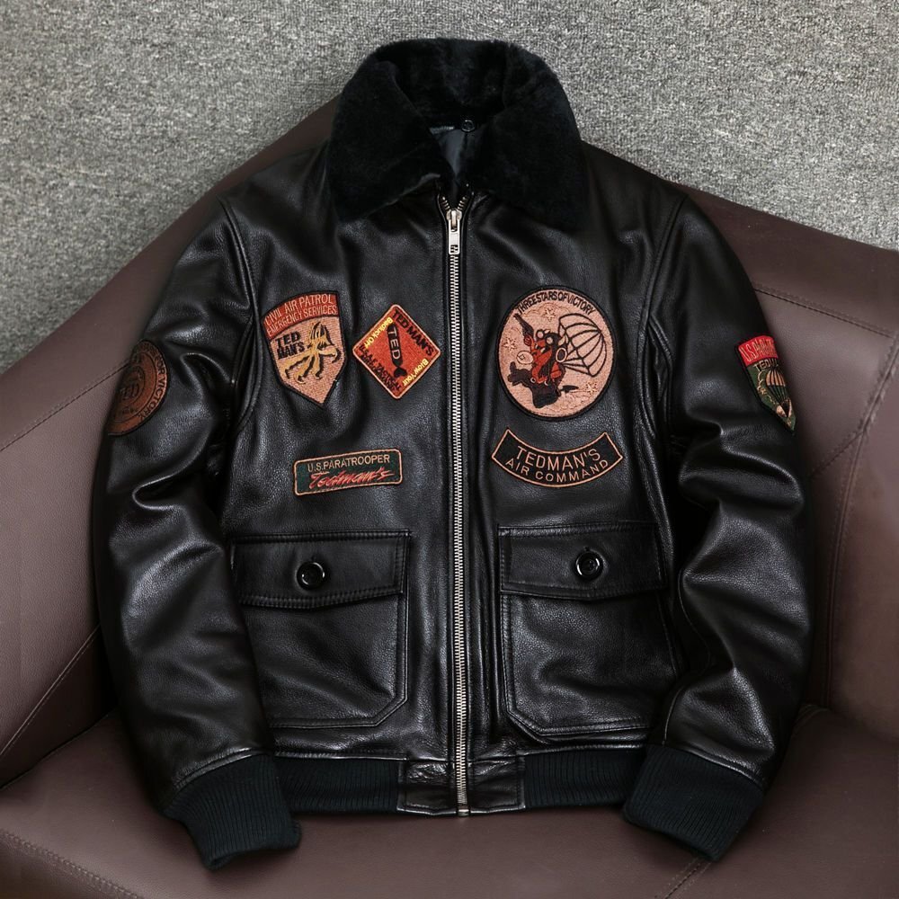 - 牛革 レザージャケット 中綿 革ジャン カウハイド フライトジャケット 本革 ウール襟 コート メンズファッション 刺繍 S~5XL